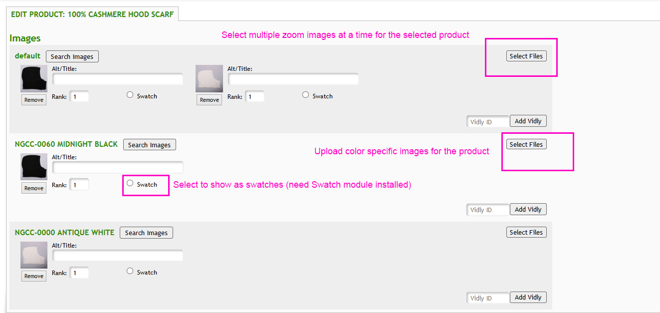 It is a self administered module which allows you to upload large images of all products that are usually around 1000 pixels wide by proportion. Product images on the detail view come from this module. In this module you can upload separate images for each color of the products.
