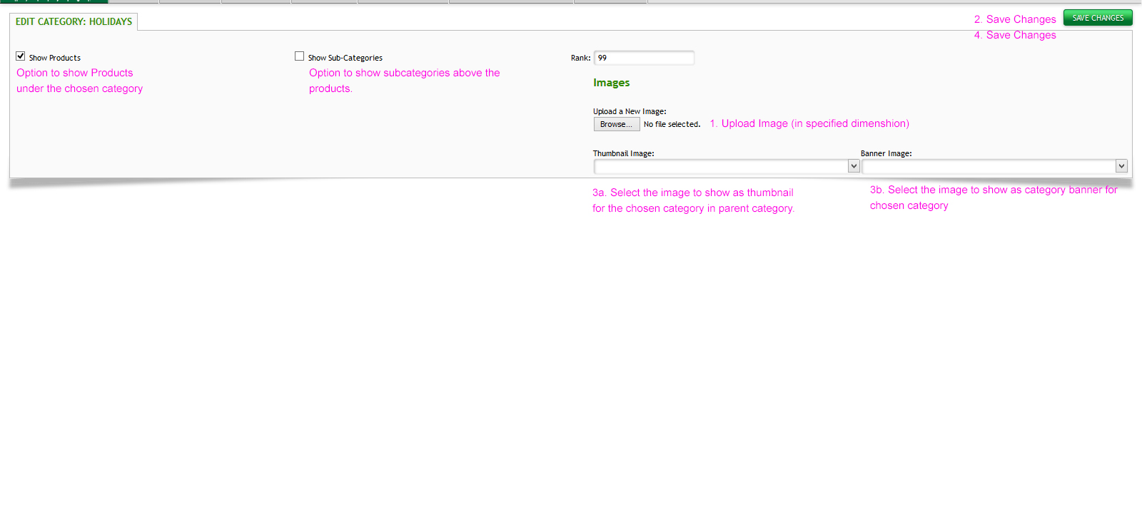 You will upload images in the sizes as provided by AdVision or you can add banner images to show above all the thumbnail images for a category. Something like this: