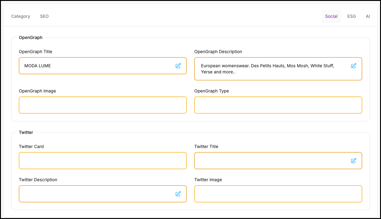 The Category Social tab controls how category pages are represented when shared on social platforms such as Facebook, LinkedIn, X (Twitter), and similar networks.