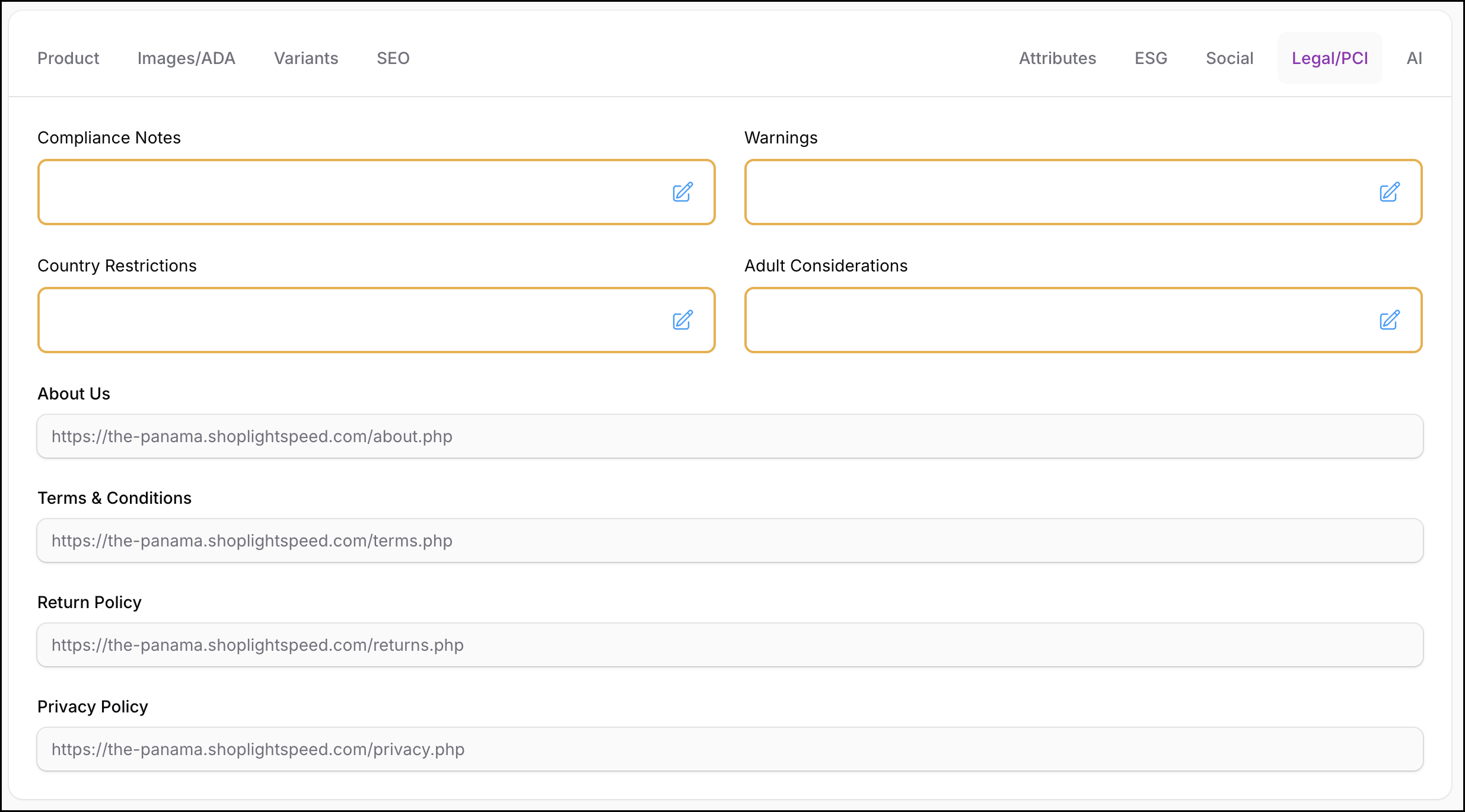 The Legal / PCI tab combines two distinct categories of information: