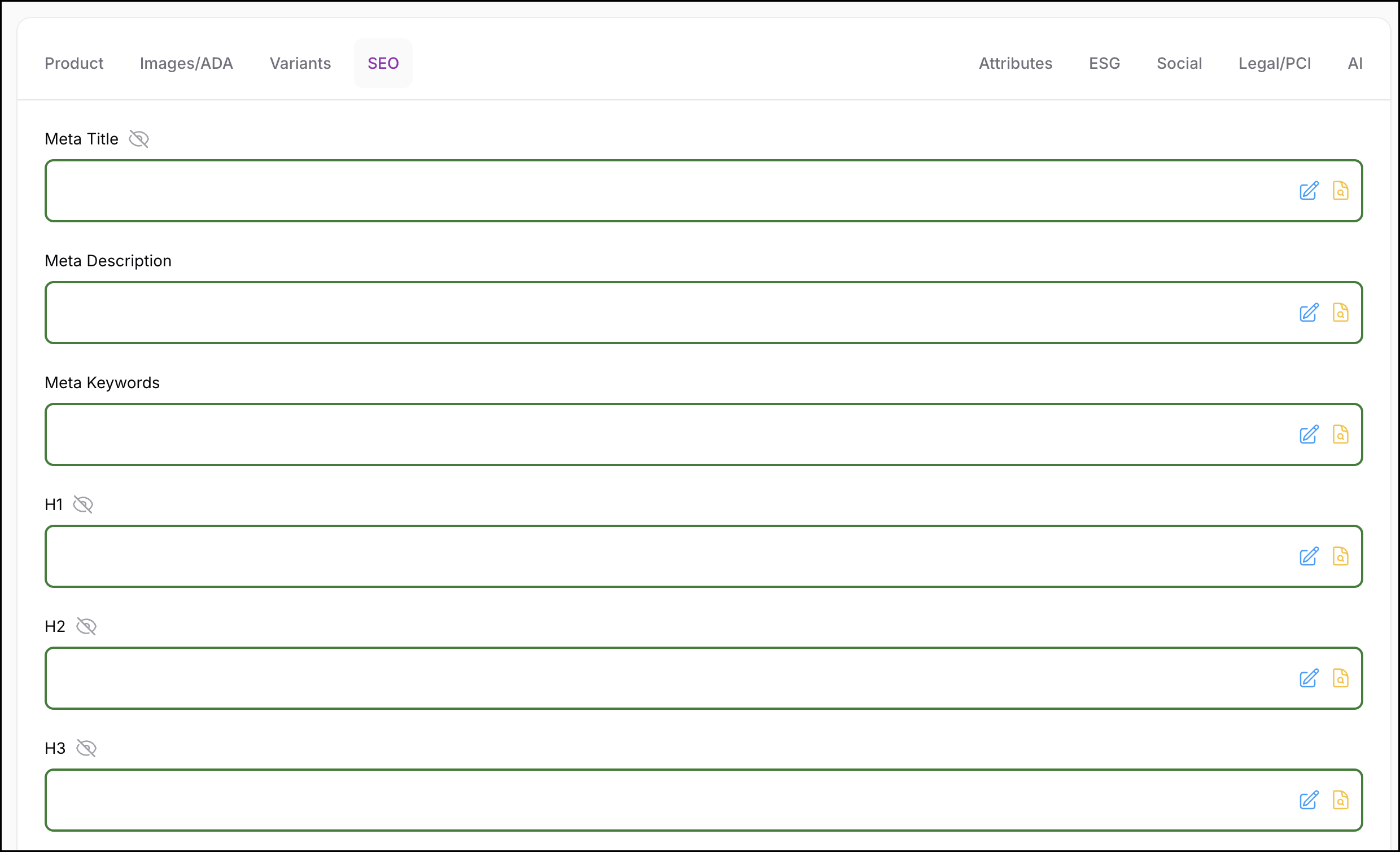 All SEO fields support editing, with the same controls used throughout CatalogPilot: