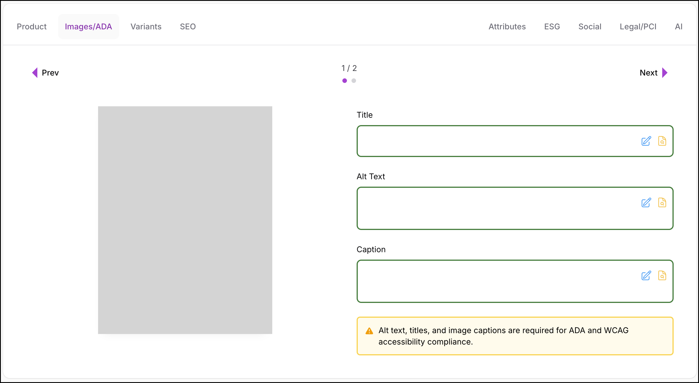 The Images / ADA tab displays accessibility-optimized metadata generated for each product image. This information is machine-read first and is primarily consumed by screen readers, search engines, and accessibility tools—not by shoppers directly.