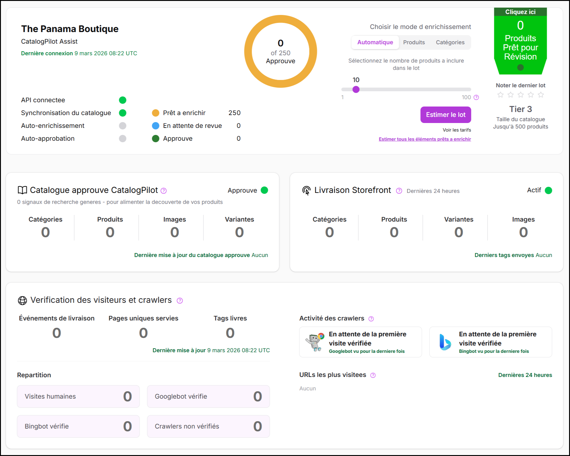 Le tableau de bord est le centre de contrôle opérationnel de CatalogPilot. Il offre aux commerçants une vue en temps réel et de haut niveau de l’état du catalogue, de la progression des enrichissements, des éléments à examiner, de l’activité de diffusion et des limites d’abonnement — sans nécessiter de connaissances techniques.