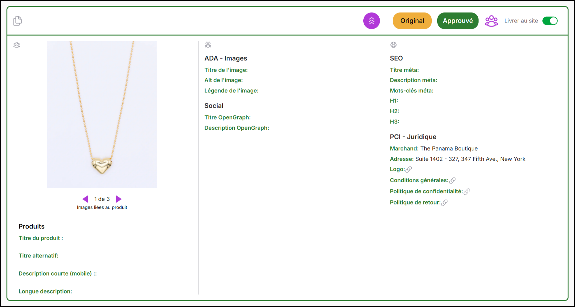 La plupart des données étendues (variantes, images, catégories) hérite de manière sûre de la logique produit approuvée et ne nécessite pas de vérification manuelle.