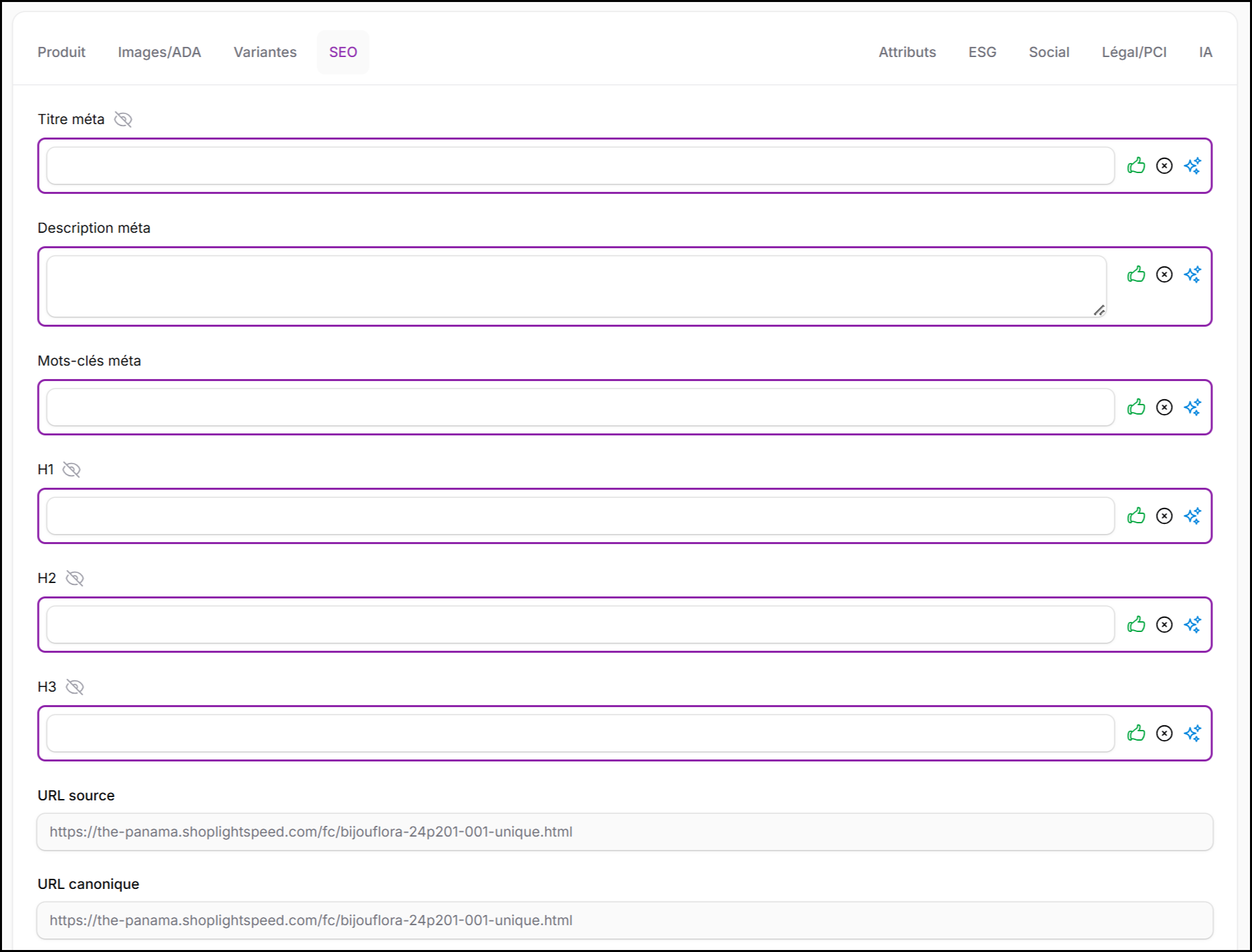 L’onglet SEO affiche et gère l’ensemble des métadonnées orientées moteurs de recherche générées par CatalogPilot pour un produit. Ces informations sont principalement destinées à une lecture machine et sont conçues avant tout pour les moteurs de recherche, moteurs d’achat et robots d’IA, plutôt que pour les visiteurs humains.