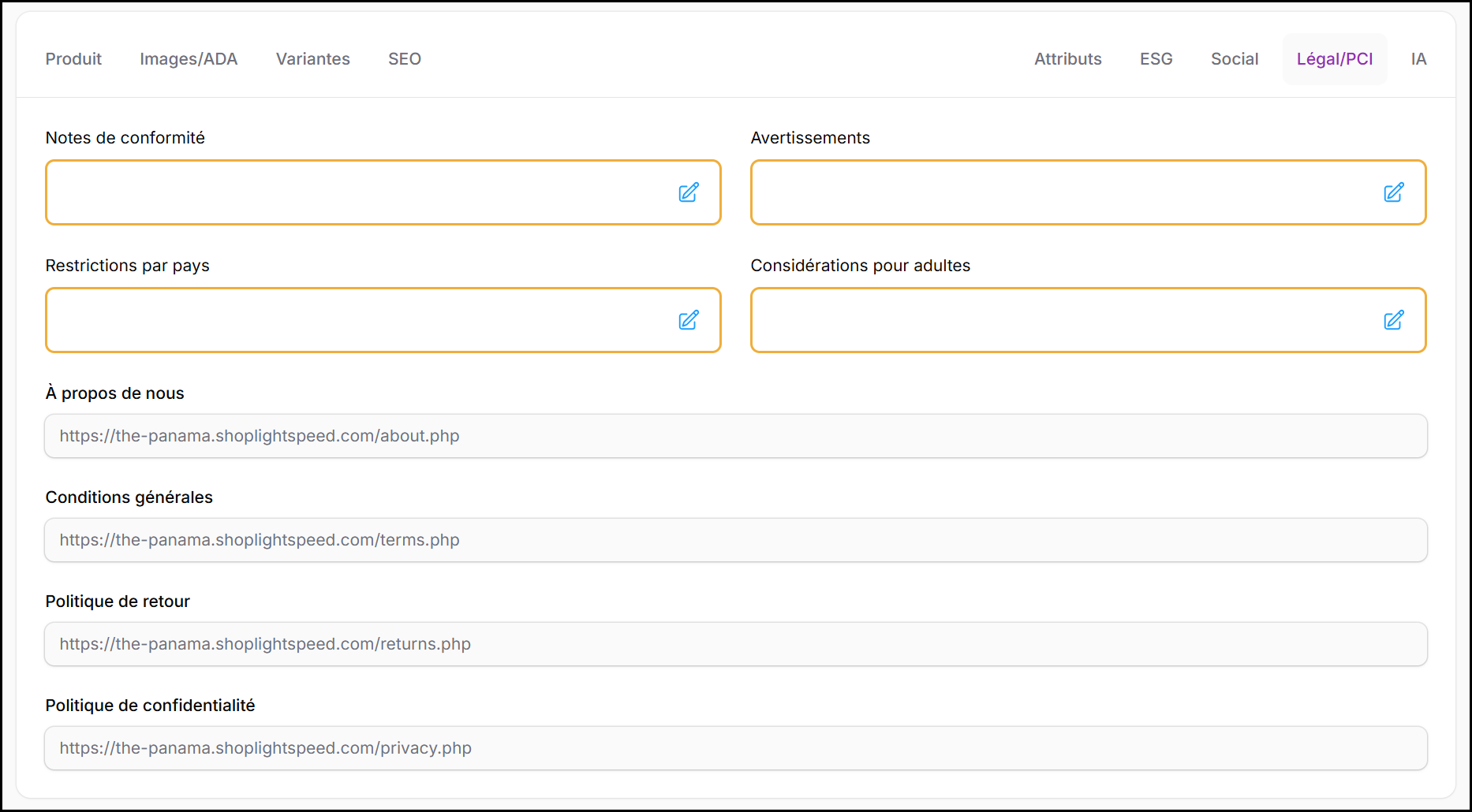 Les commerçants peuvent modifier les champs de conformité spécifiques au produit uniquement lorsque les informations sont connues et vérifiables.