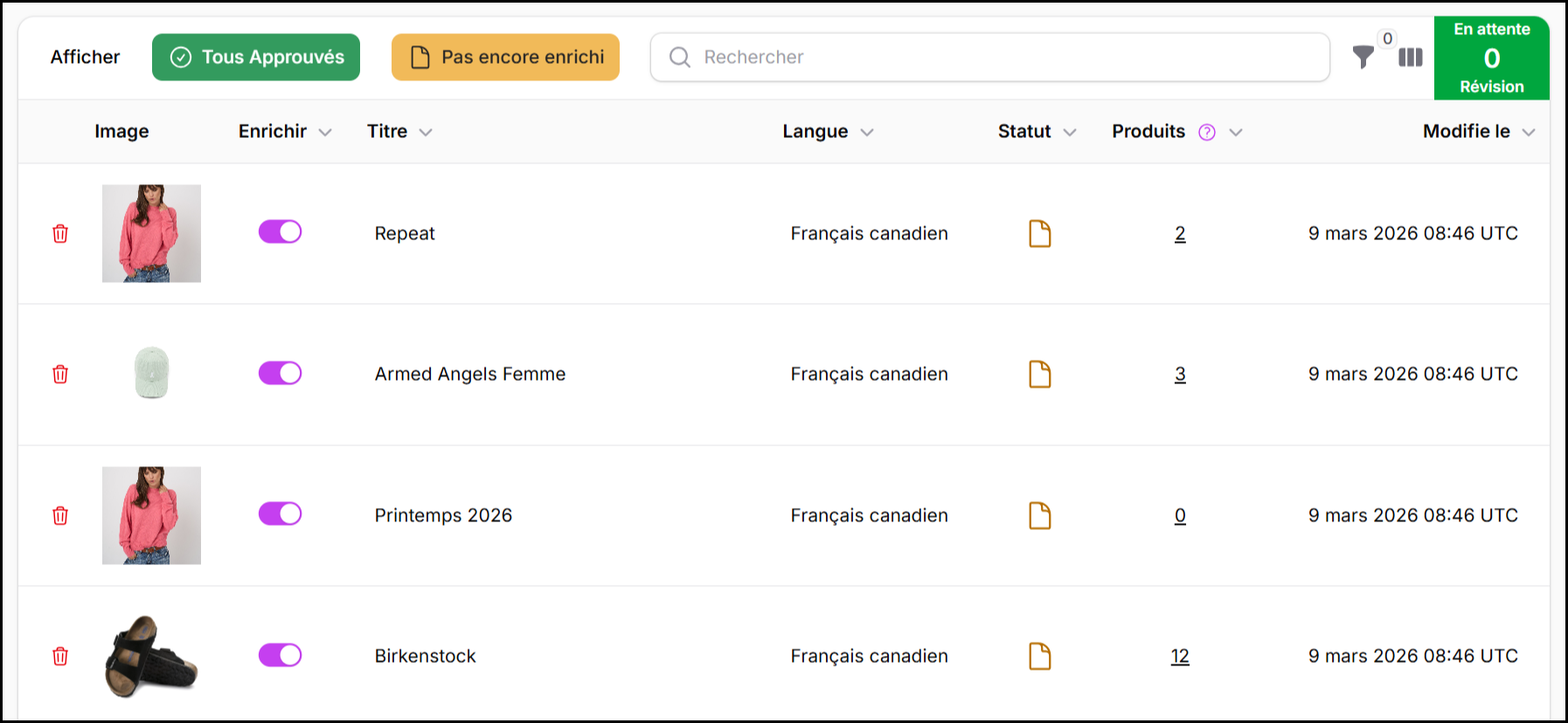 La Vue Liste des Catégories offre aux marchands une vue structurée et à faible charge cognitive de toutes les catégories détectées dans leur catalogue ainsi que de leur relation avec les produits enrichis. Bien que les catégories ne soient pas enrichies de manière isolée, elles jouent un rôle essentiel dans la structuration de la découverte des produits, de l’indexation et de la navigation au sein du storefront.