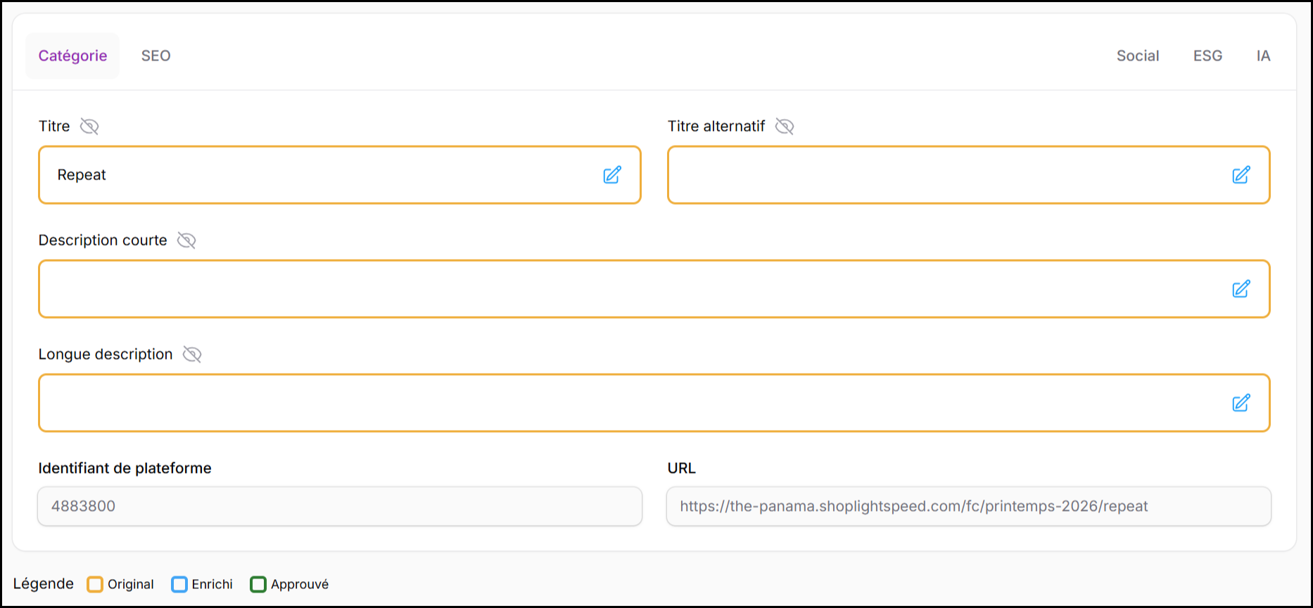 Chaque champ de l’onglet Catégorie suit la même logique visuelle utilisée dans tout CatalogPilot :