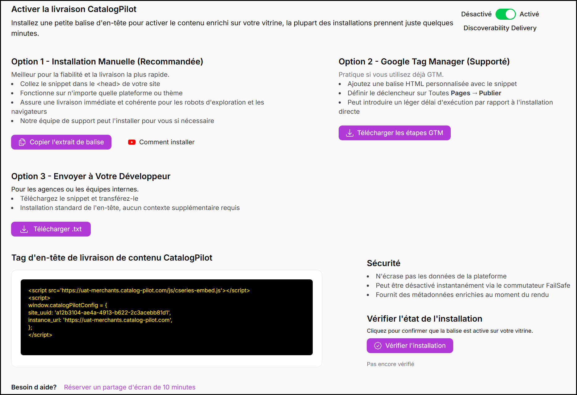 Le script de diffusion affiché sur cette page est unique à votre compte et à votre environnement.