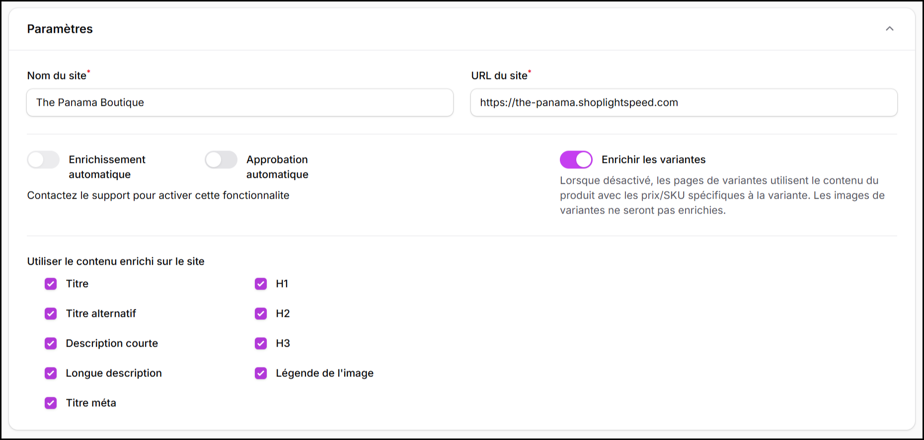 Cette section permet aux marchands de désactiver sélectivement la diffusion du contenu enrichi pour certains champs visibles par les humains, tout en conservant l’enrichissement en interne.