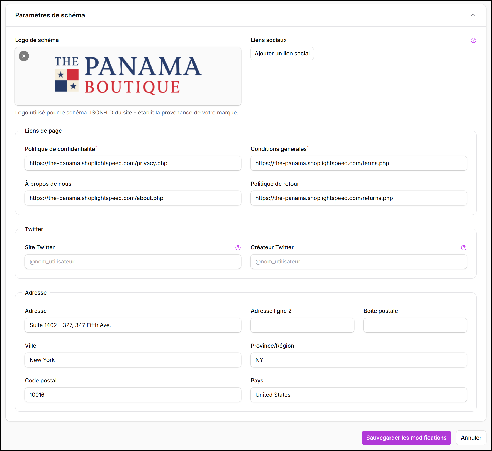 Cette section contrôle la manière dont votre marque, vos politiques et l’identité de votre entreprise sont représentées dans les données structurées (JSON-LD) et les aperçus sociaux sur votre storefront.