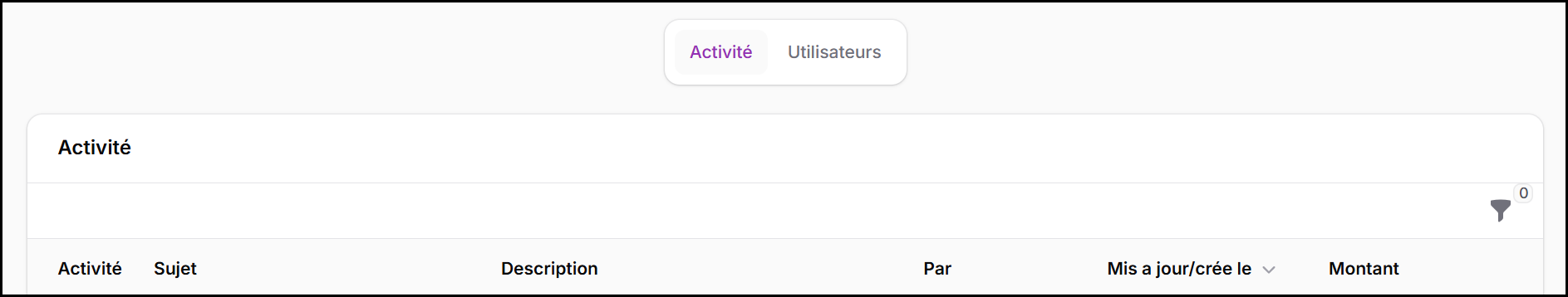 L’onglet Activité affiche une chronologie détaillée des actions effectuées dans l’ensemble du système, y compris, sans s’y limiter :