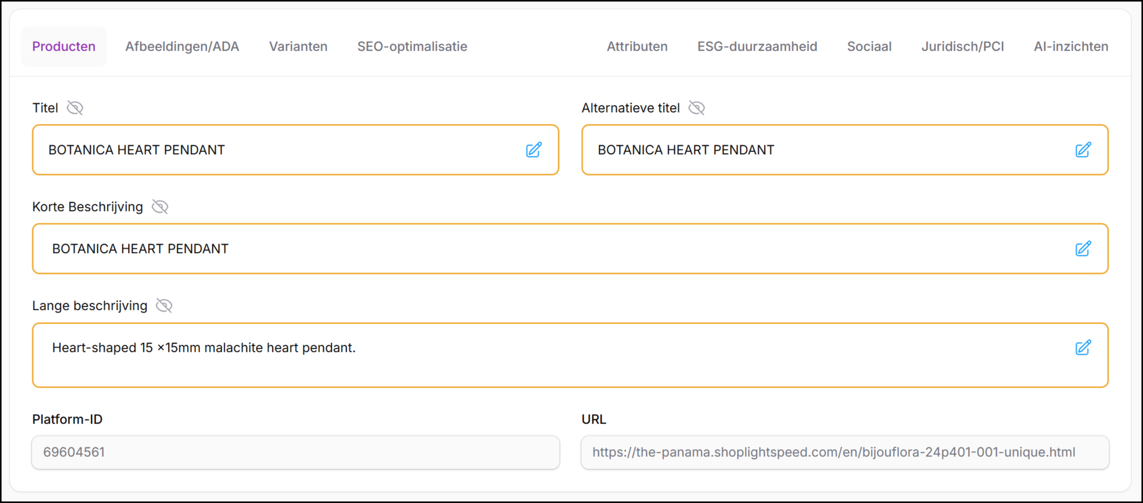 Het Product-tabblad biedt gestructureerde, veld-voor-veld toegang tot kernproductcontent.