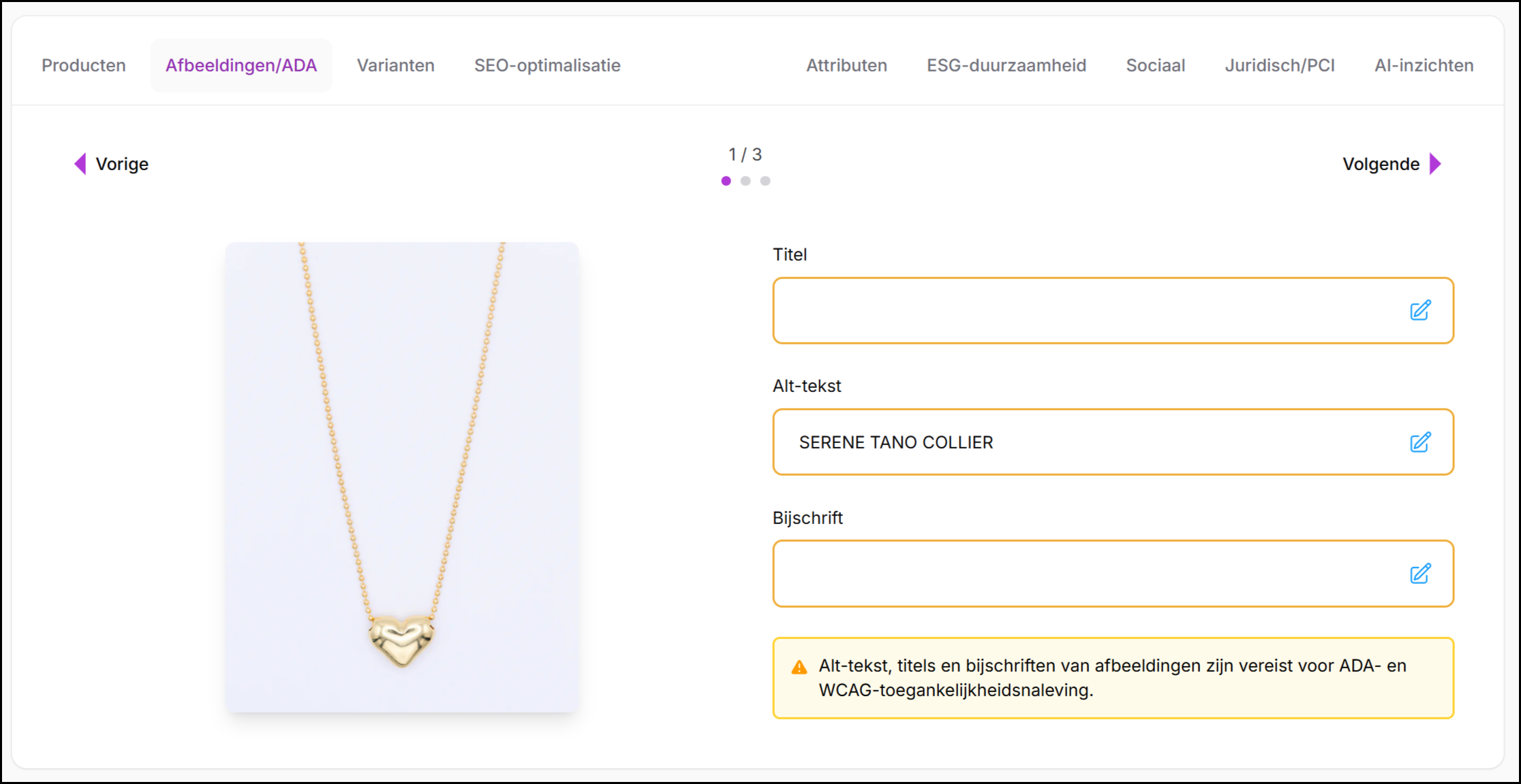 Het tabblad Afbeeldingen / ADA toont toegankelijkheidsgeoptimaliseerde metadata die voor elke productafbeelding wordt gegenereerd. Deze informatie is primair machine-leesbaar en wordt voornamelijk gebruikt door schermlezers, zoekmachines en toegankelijkheidstools — niet direct door shoppers.