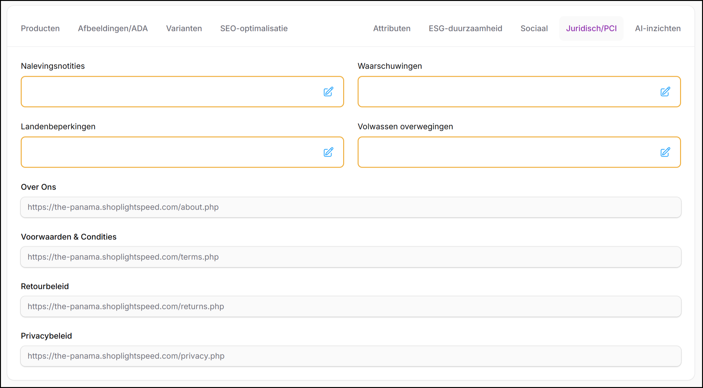 De Juridisch / PCI-tab koppelt geverifieerde juridische, compliance- en herkomstinformatie aan elk productrecord.