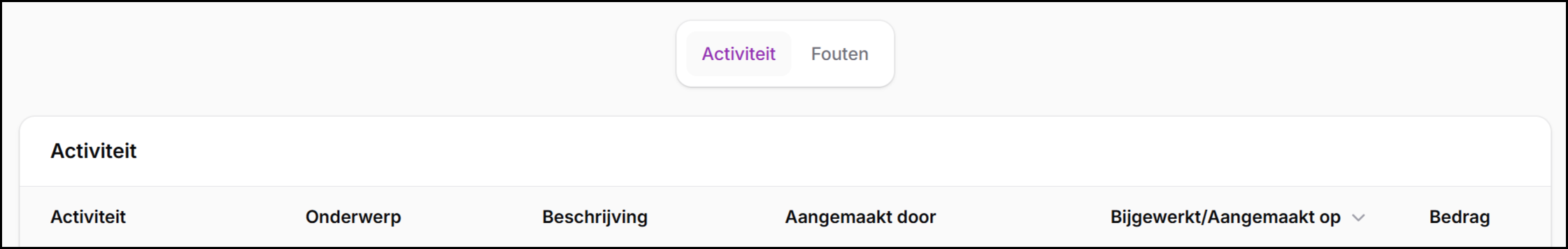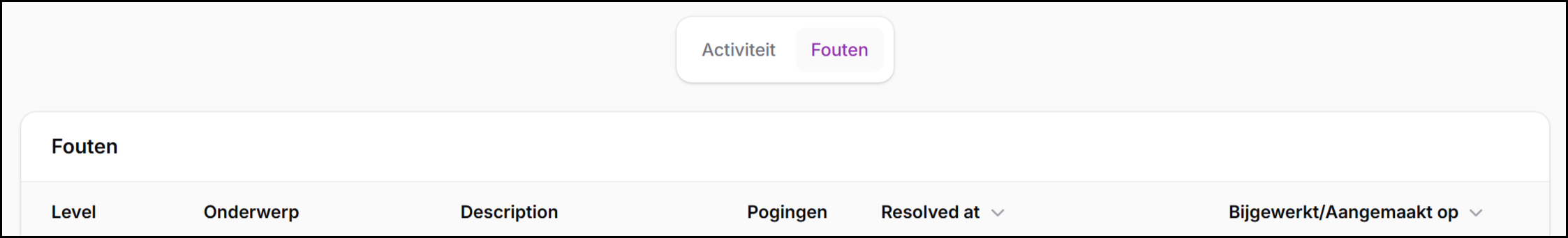 De tabbladen Activiteit en Fouten zijn bewust rustig gehouden: