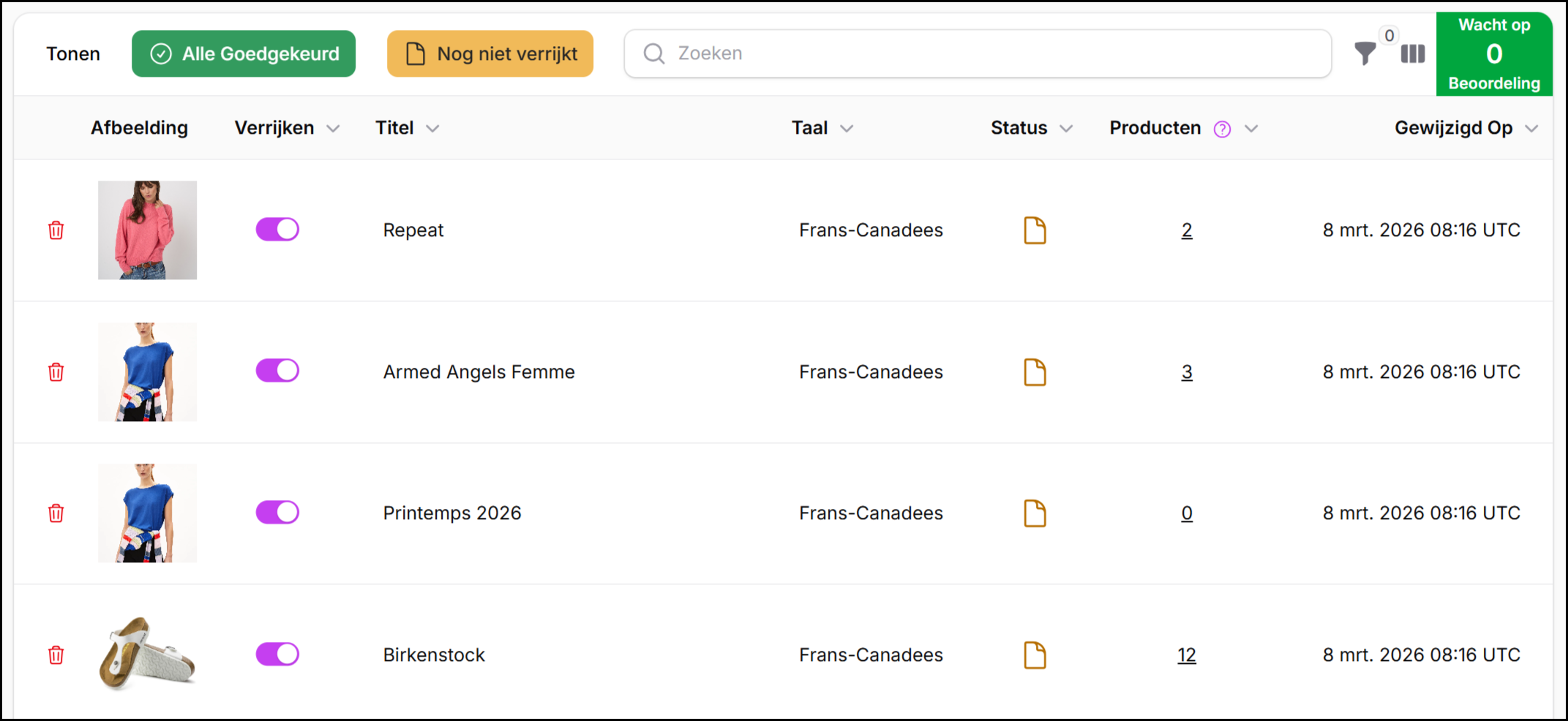 De categorielijstweergave biedt handelaren een gestructureerd overzicht met lage cognitieve belasting van alle gedetecteerde categorieën in hun catalogus en hun relatie tot verrijkte producten. Hoewel categorieën niet afzonderlijk worden verrijkt, spelen zij een essentiële rol bij productontdekking, indexering en storefront-navigatie.