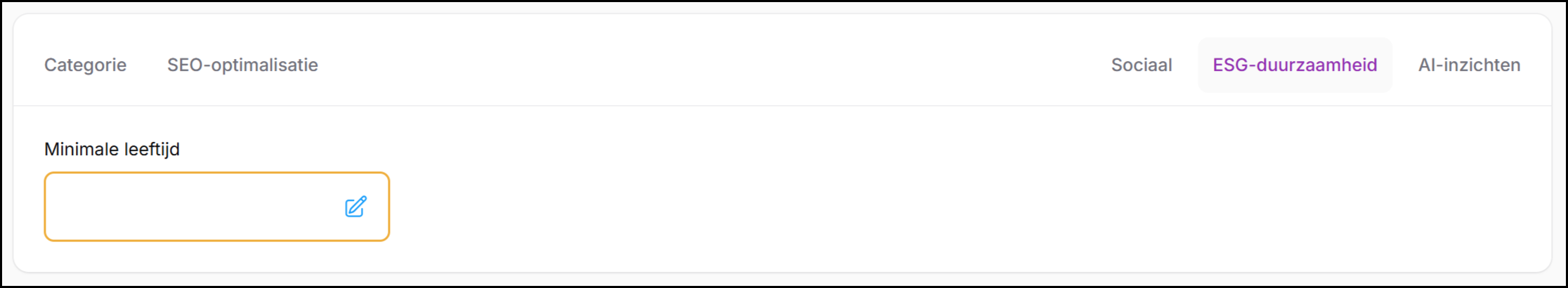 - Sommige categorieën kunnen extra ESG-velden tonen afhankelijk van productsamenstelling of compliance-relevantie.