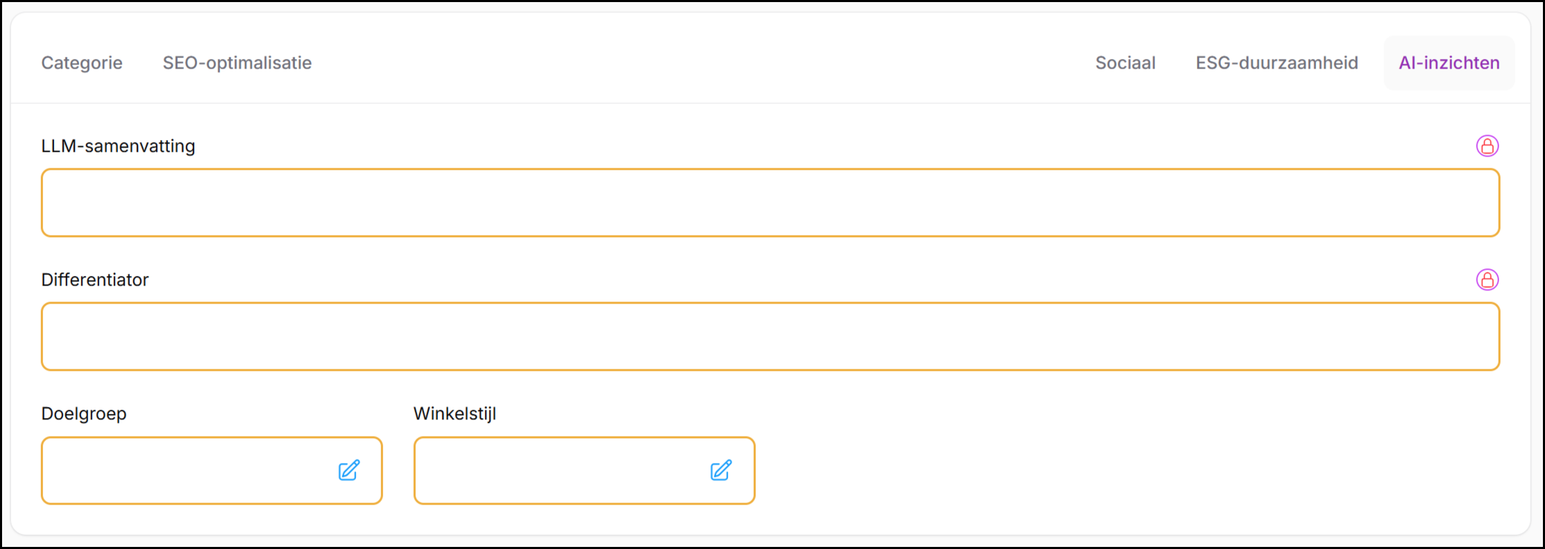 Het AI-tabblad voor categorieën kan de volgende velden bevatten: