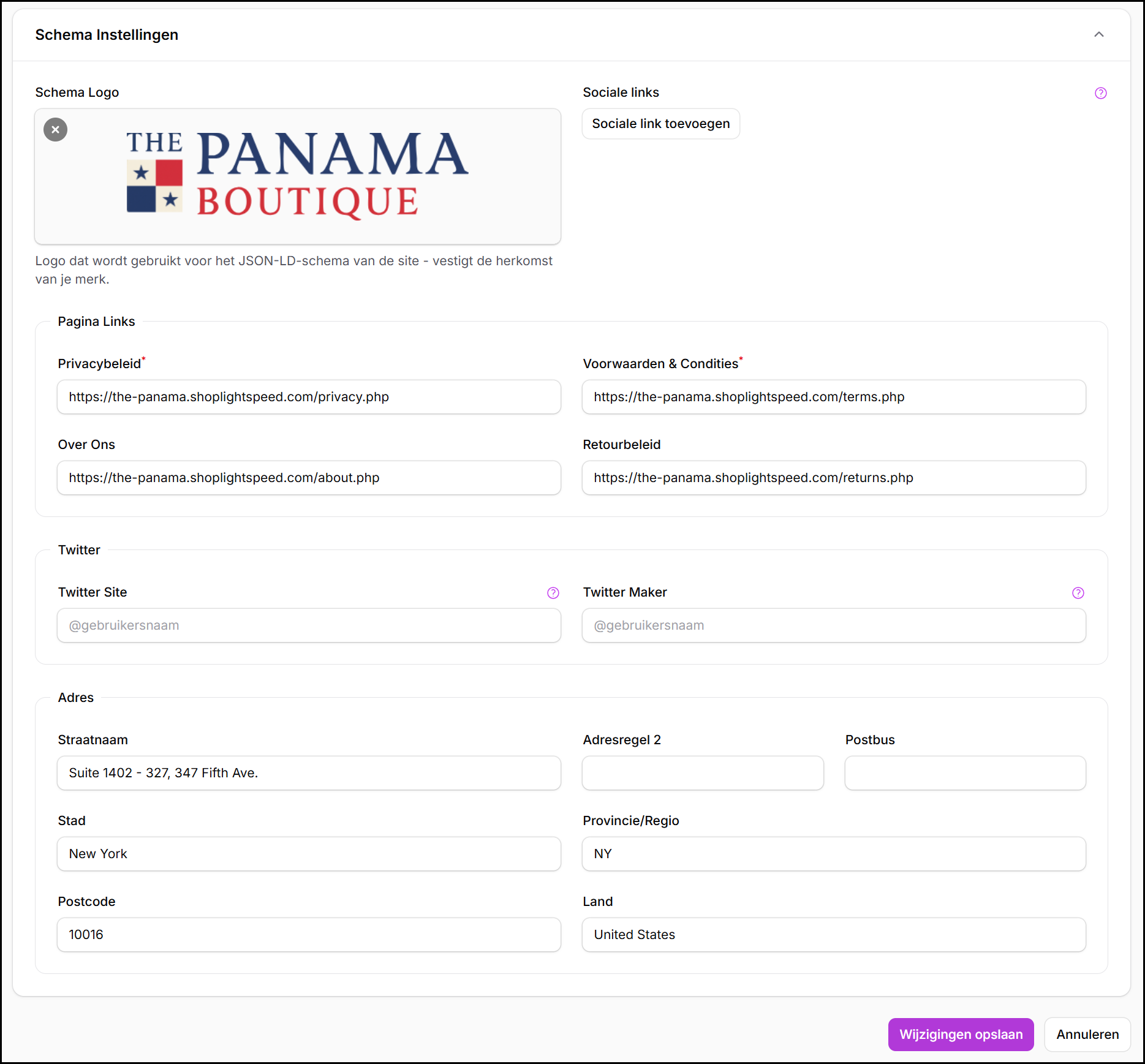 Deze sectie bepaalt hoe uw merk, beleidsdocumenten en bedrijfsidentiteit worden weergegeven in gestructureerde gegevens (JSON-LD) en sociale previews binnen uw storefront.