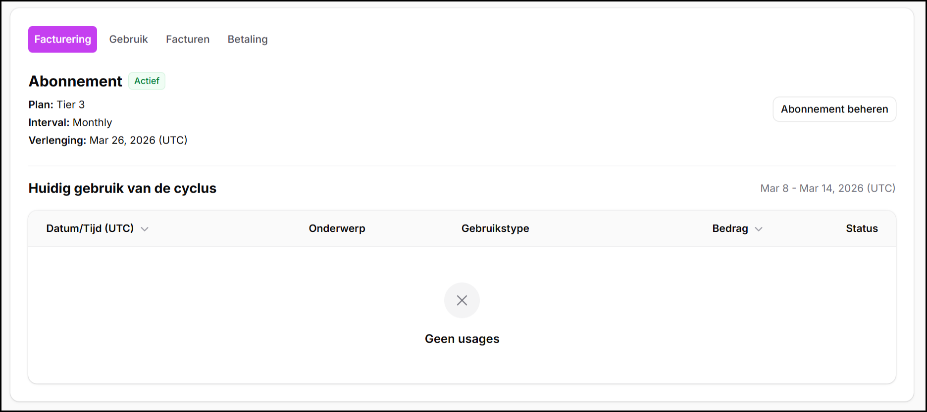 Onder de abonnementsgegevens staat het overzicht Gebruik in de huidige cyclus. Dit toont uitsluitend gebruiksgebaseerde verrijkingskosten voor de lopende factureringsperiode.
