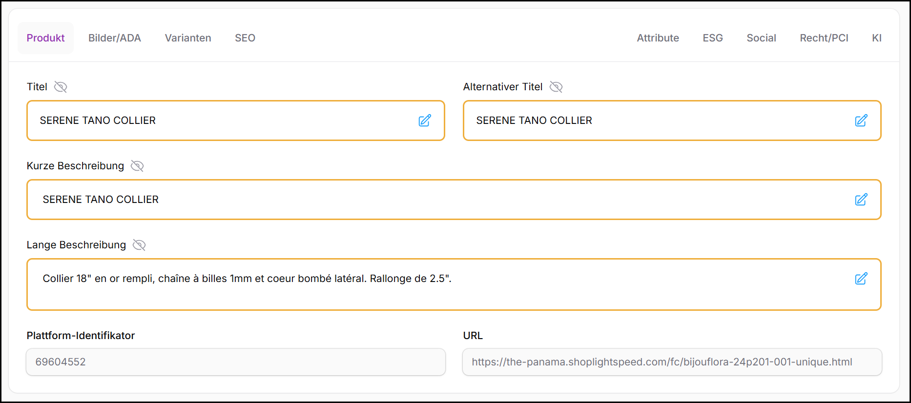 Der Produkt-Tab bietet strukturierten, feldbasierten Zugriff auf zentrale Produktinhalte.