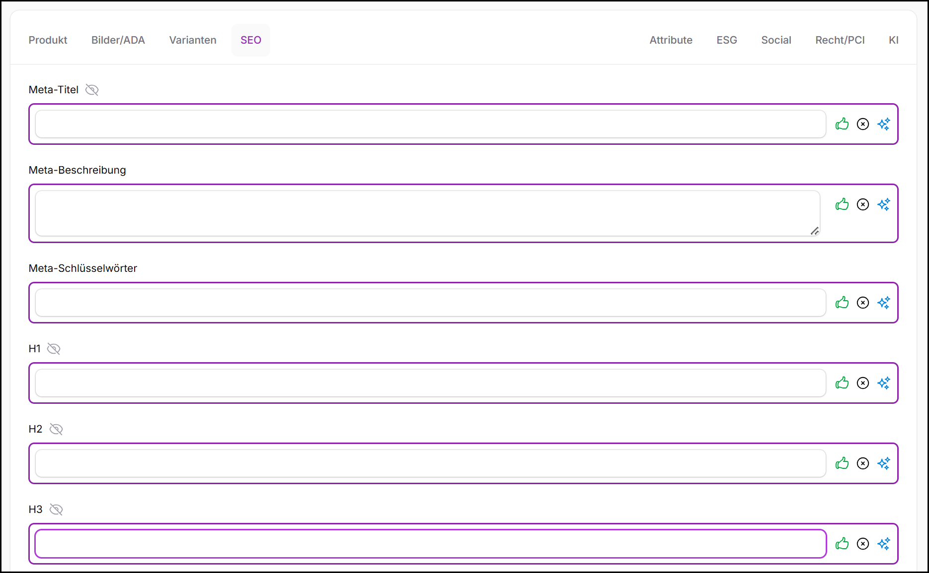 Alle SEO-Felder unterstützen die Bearbeitung mit denselben Steuerelementen wie im gesamten CatalogPilot-System: