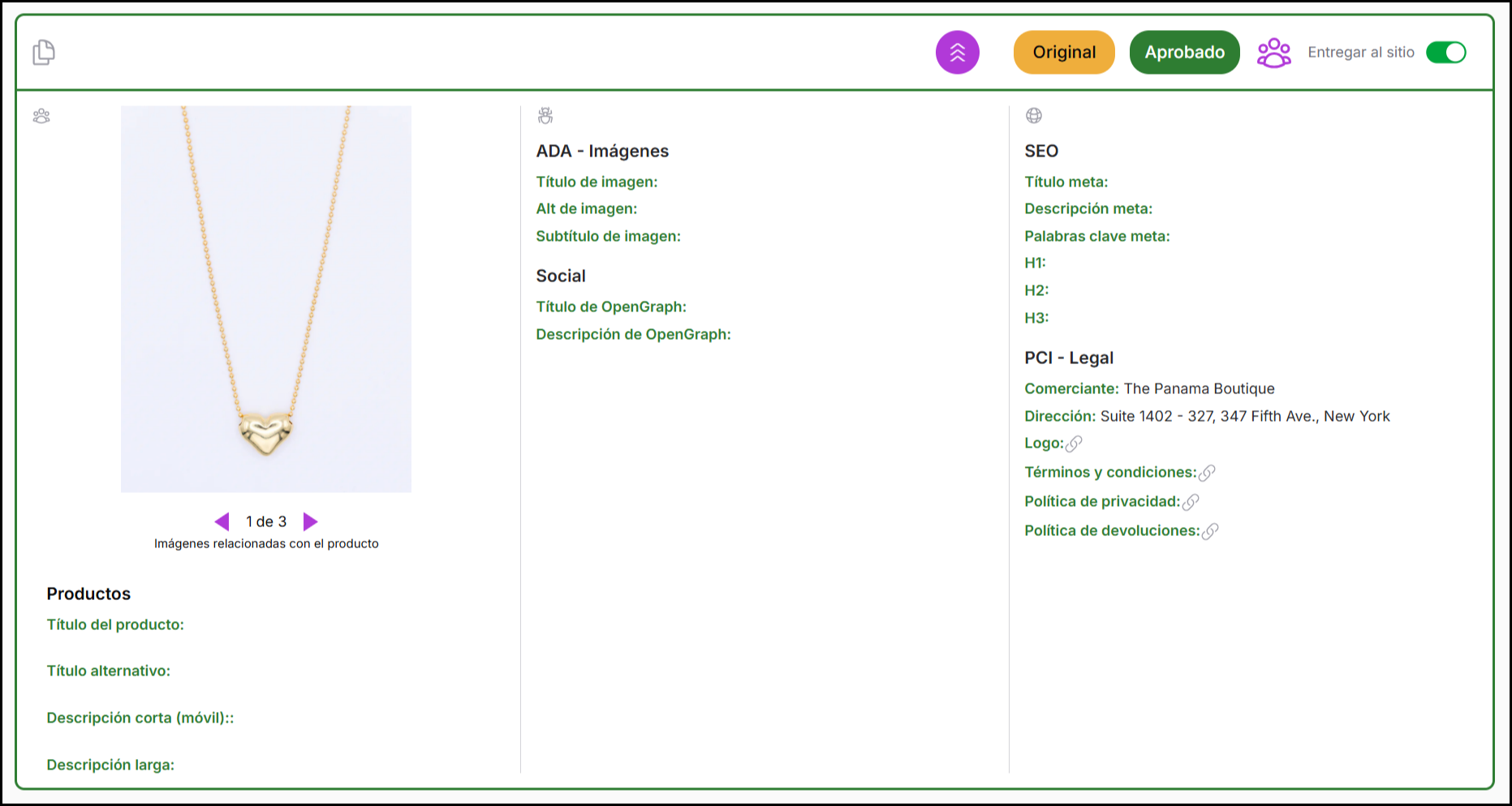 La mayoría de los datos extendidos (variantes, imágenes, categorías) heredan de forma segura la lógica de producto aprobada y no requieren verificación manual.