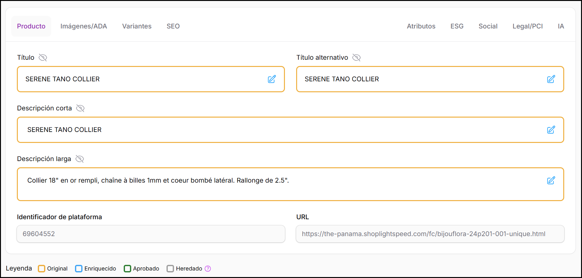 La pestaña Producto ofrece acceso estructurado, campo por campo, al contenido principal del producto.