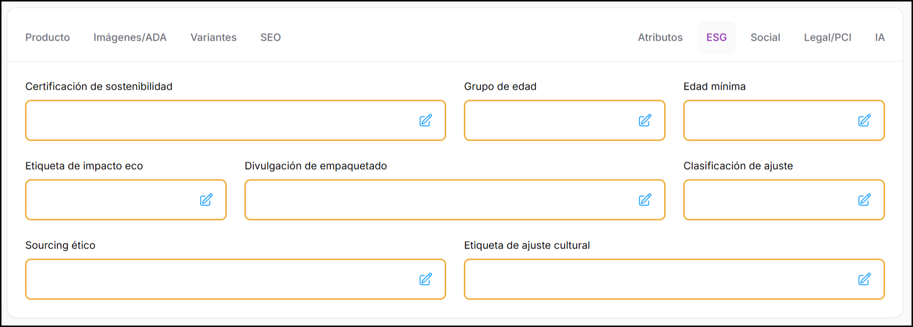 La pestaña ESG contiene campos estructurados opcionales utilizados para describir el impacto ambiental, las consideraciones éticas y el contexto cultural o social de un producto.