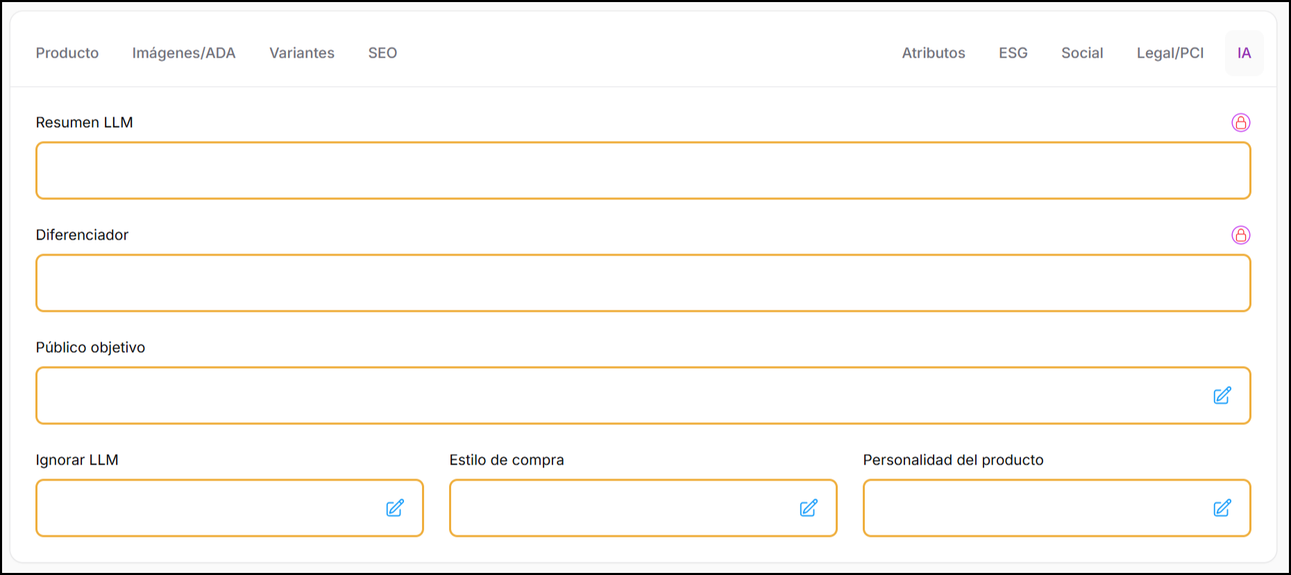 Los comerciantes pueden editar Público objetivo, Estilo de compra y Personalidad del producto si tienen una intención clara y factual.