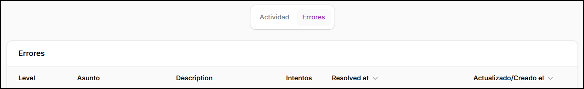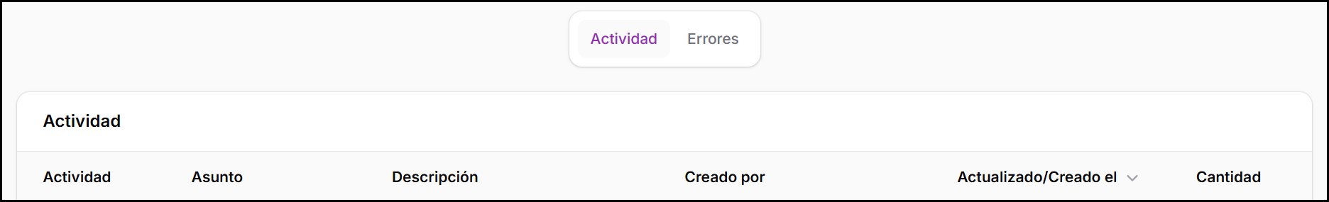 Las pestañas Actividad y Errores son deliberadamente discretas: