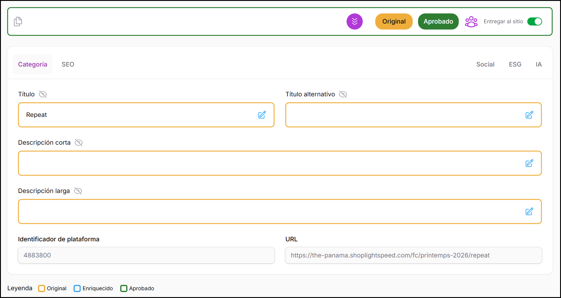 Esta pestaña es secundaria a la Galería de Categorías, que sigue siendo la vista principal para el enriquecimiento de categorías.