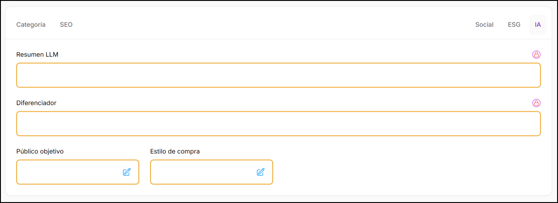 La pestaña IA de categoría puede incluir los siguientes campos: