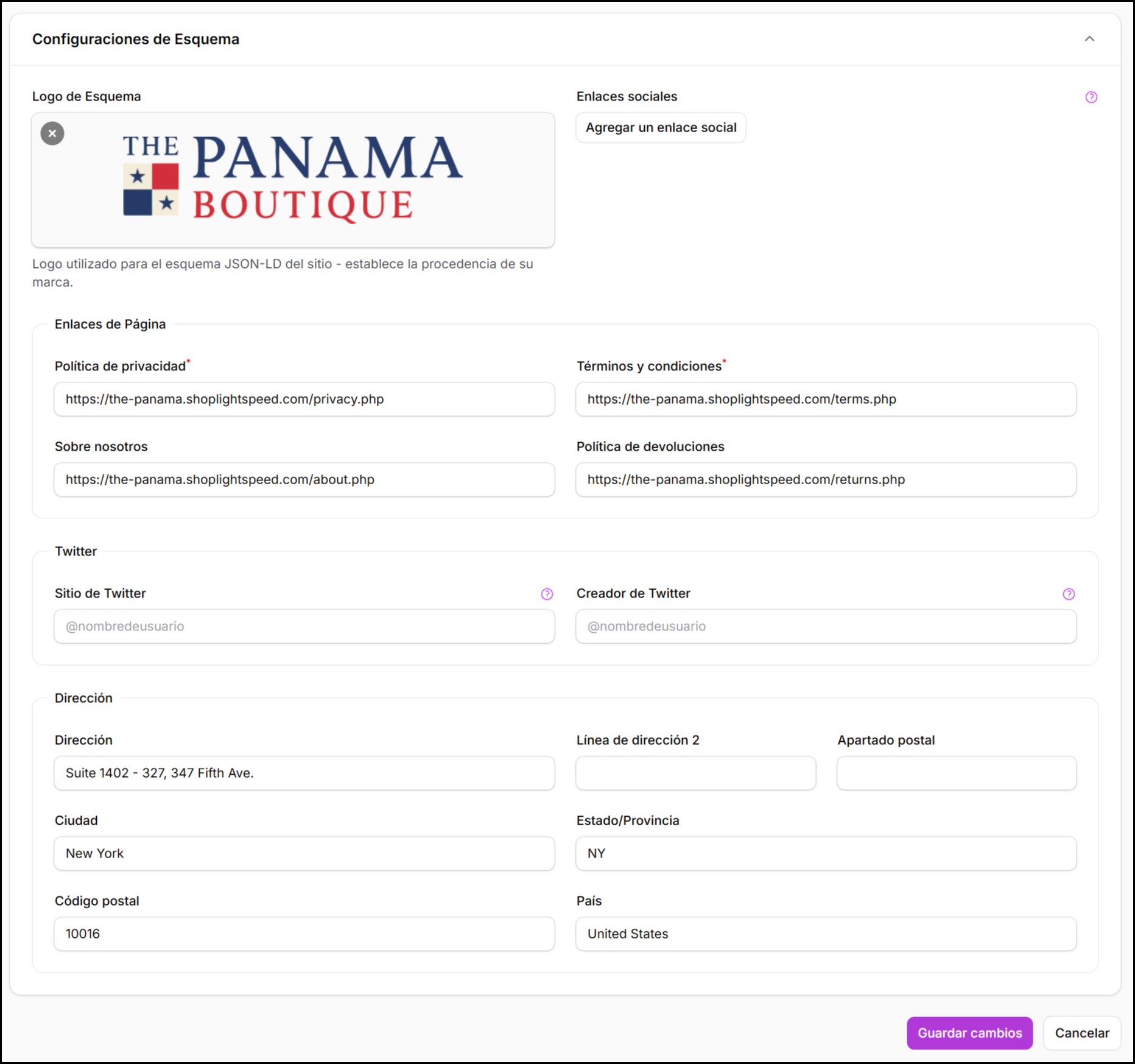 Esta sección controla cómo se representan su marca, políticas e identidad empresarial en datos estructurados (JSON-LD) y vistas previas sociales en su storefront.