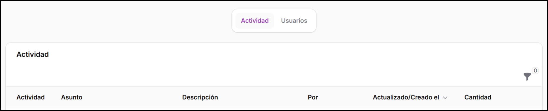 La pestaña Actividad muestra una línea de tiempo detallada de las acciones realizadas en todo el sistema, incluyendo, entre otras: