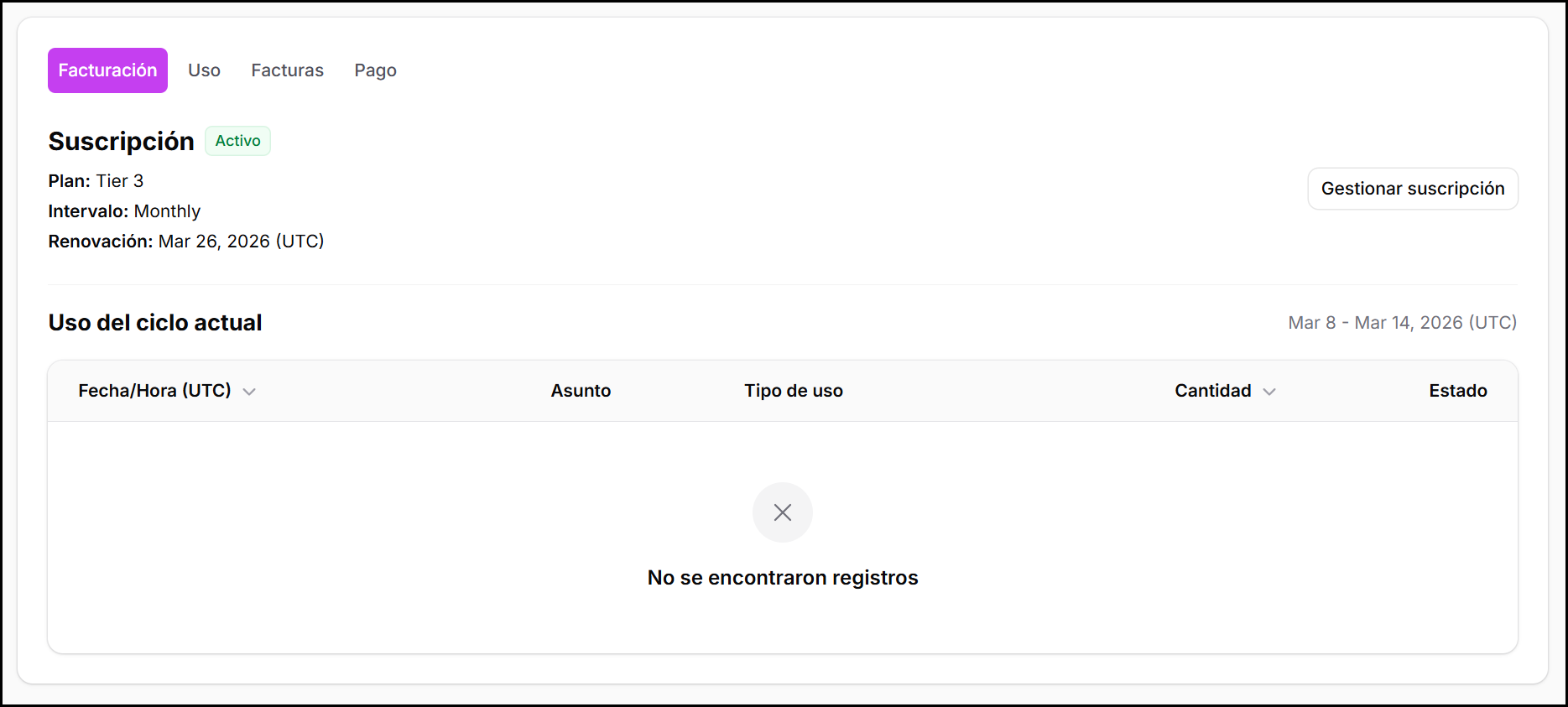 Debajo de los detalles de la suscripción se encuentra el resumen Uso del ciclo actual, que refleja únicamente los costos de enriquecimiento por uso del período de facturación en curso.