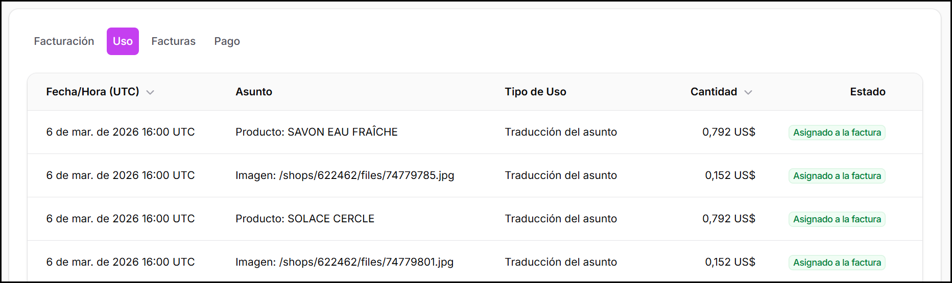 Todas las acciones — facturables o no — se registran en otros lugares para la transparencia del sistema, pero la pestaña Uso se centra exclusivamente en eventos de enriquecimiento facturables.