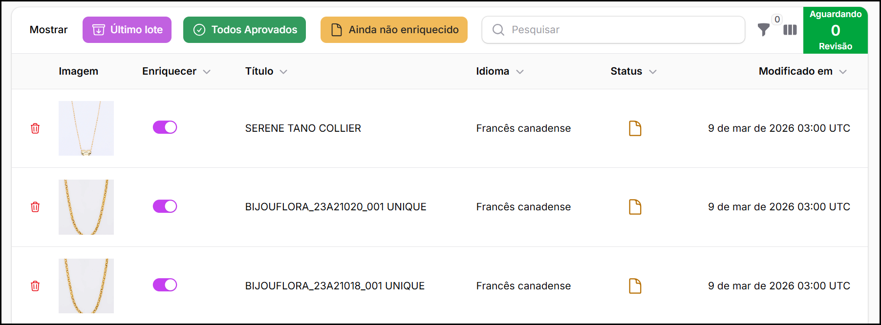 - Ver o status atual de enriquecimento e entrega de todos os produtos