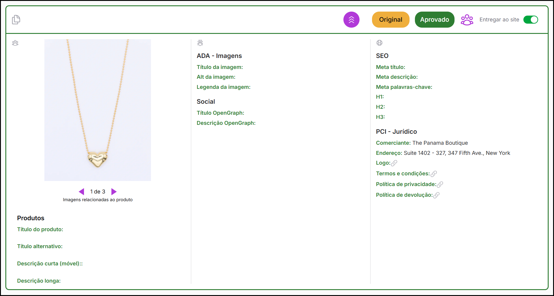 É aqui que os lojistas conseguem ver claramente, de relance, o que o CatalogPilot mudou, por que mudou e como esses dados serão interpretados por mecanismos de busca e sistemas de IA — sem serem obrigados a editar ou aprovar cada campo individualmente.