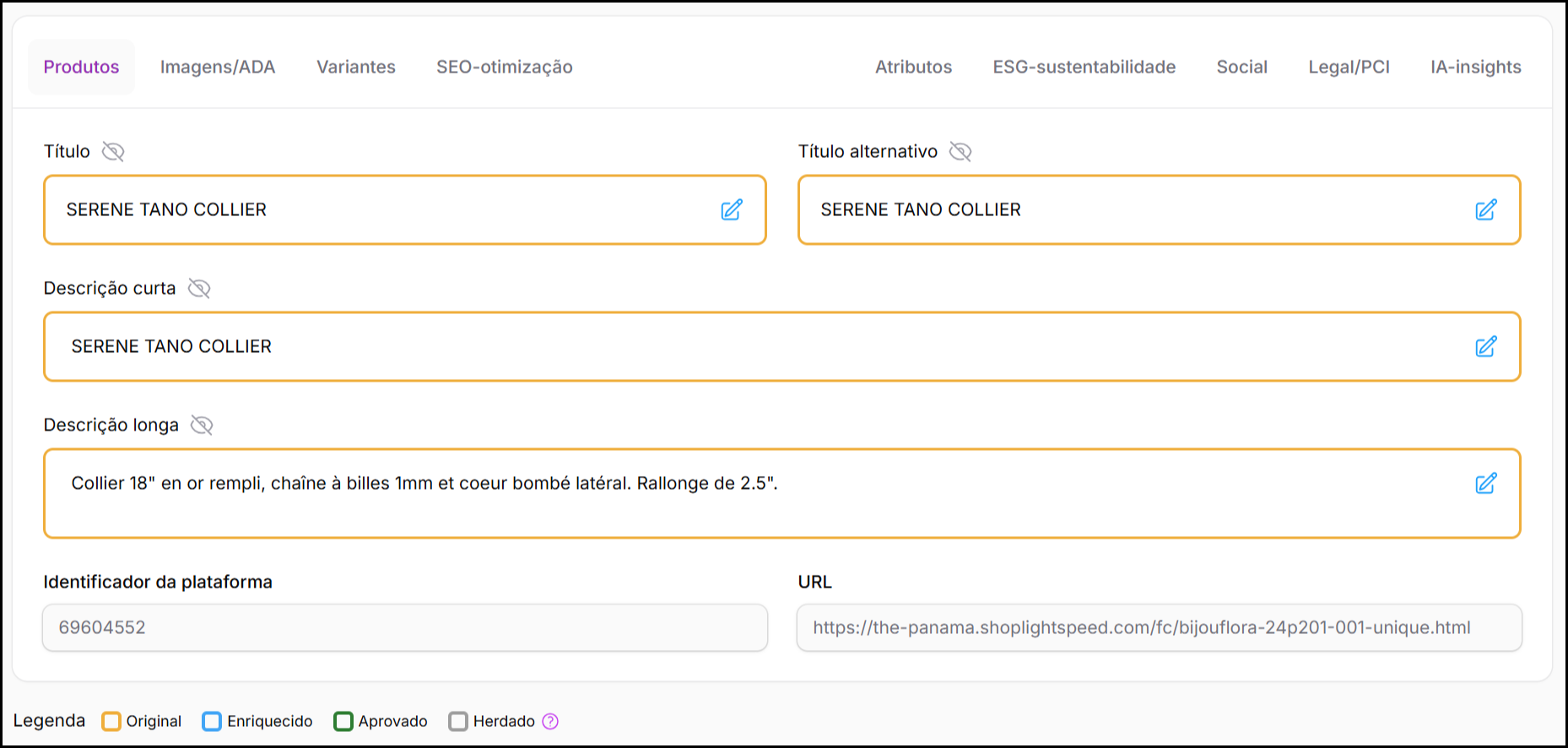 Normalmente, os lojistas chegam à aba Produto apenas depois de revisar visualmente o conteúdo na galeria e decidir que ajustes direcionados são necessários.