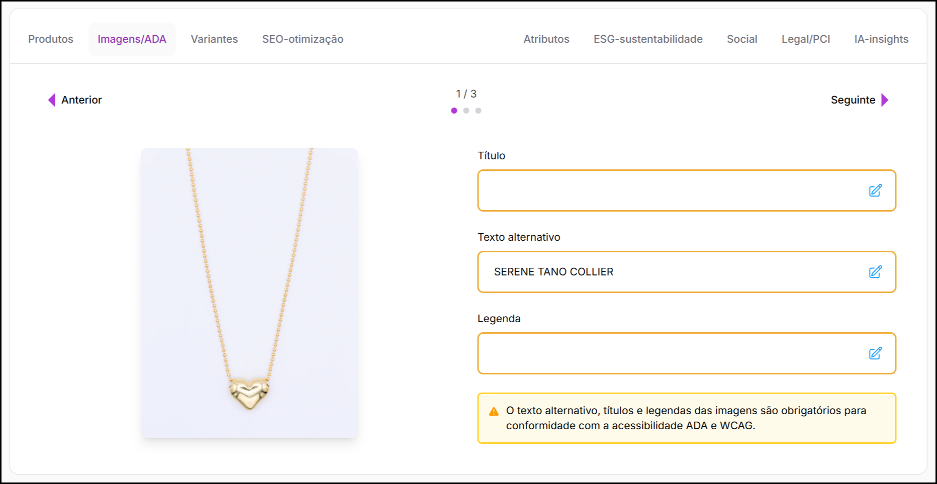 A aba Imagens / ADA exibe metadados otimizados para acessibilidade gerados para cada imagem do produto. Essas informações são primariamente legíveis por máquinas e são consumidas por leitores de tela, mecanismos de busca e ferramentas de acessibilidade — não diretamente por compradores.