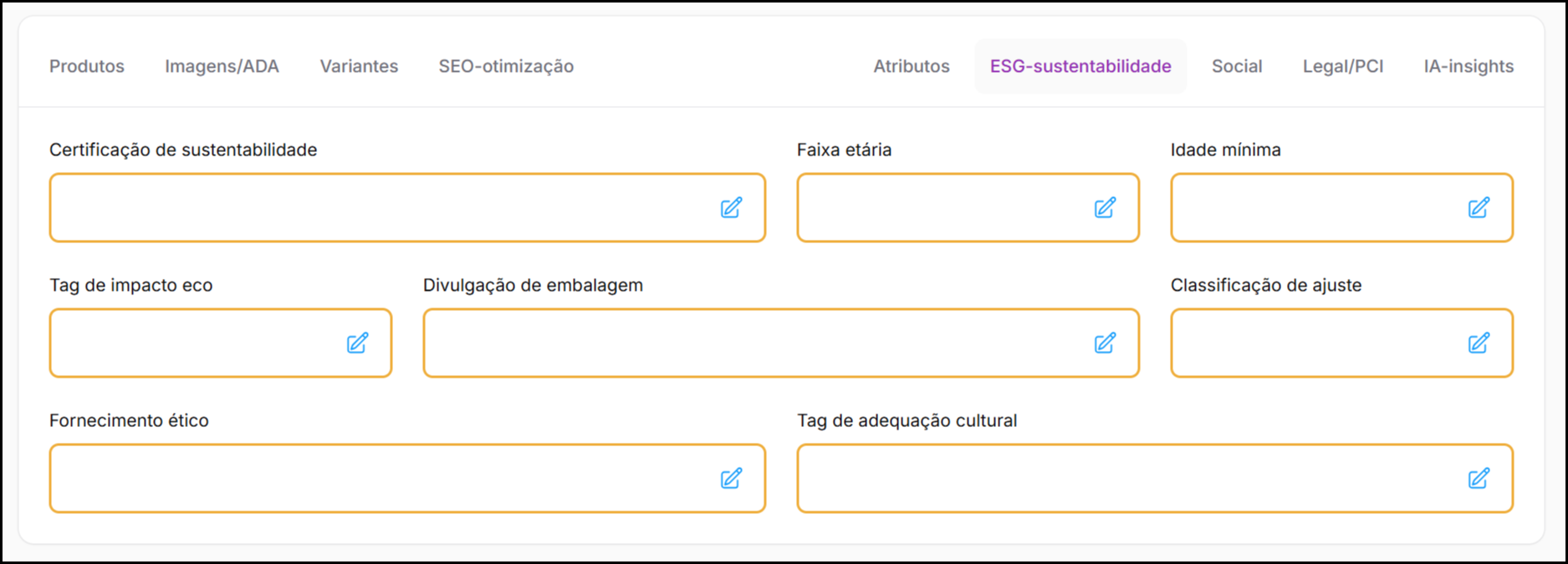 A aba ESG contém campos estruturados opcionais usados para descrever impacto ambiental, considerações éticas e contexto cultural ou social relacionados a um produto.