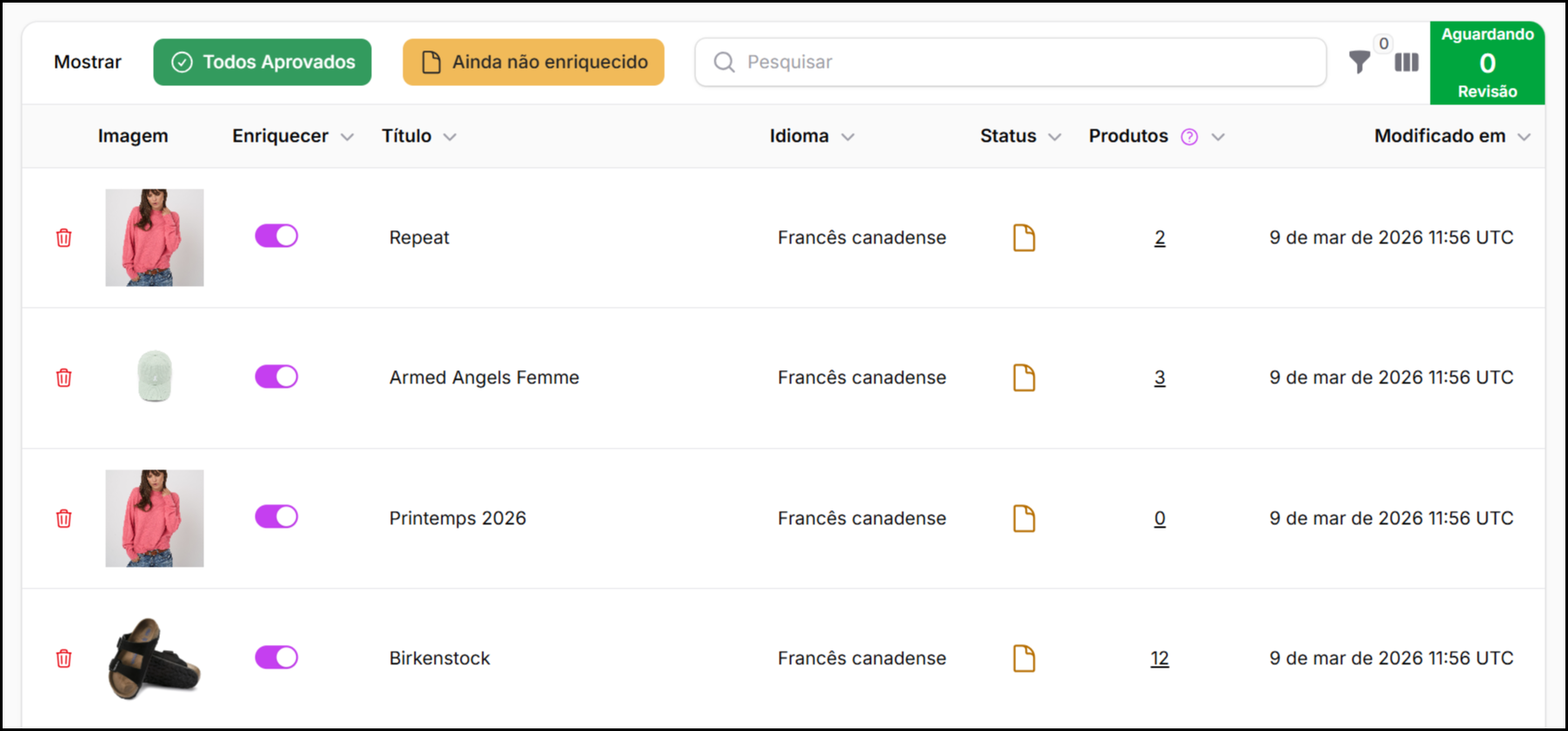 A Visualização de Lista de Categorias fornece aos lojistas uma visão estruturada e de baixa carga cognitiva de todas as categorias detectadas no catálogo e de sua relação com os produtos enriquecidos. Embora as categorias não sejam enriquecidas de forma isolada, elas desempenham um papel essencial na estruturação da descoberta de produtos, indexação e navegação do storefront.