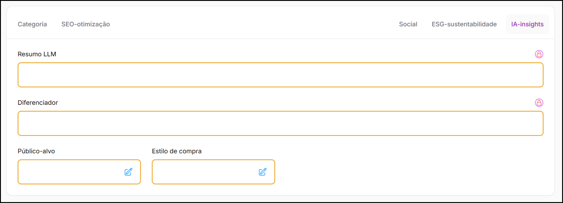 A aba IA de categoria fornece contexto avançado orientado a máquinas, projetado para ancorar uma categoria em sistemas de busca, recomendação e descoberta baseados em IA.