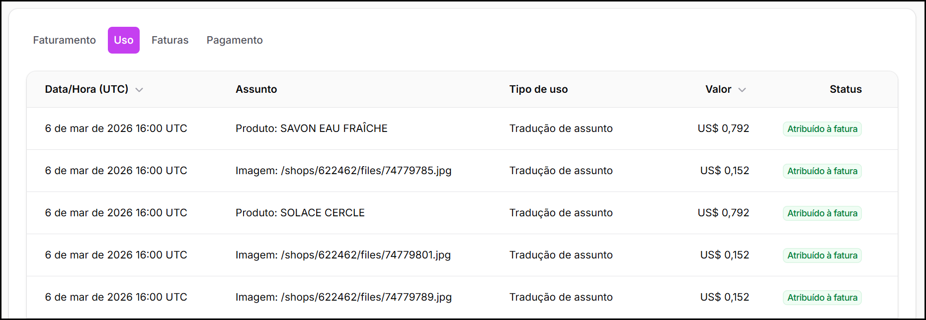 Todas as ações — faturáveis ou não — são registradas em outros locais para fins de transparência do sistema, mas a aba Uso concentra-se exclusivamente nos eventos de enriquecimento faturáveis.