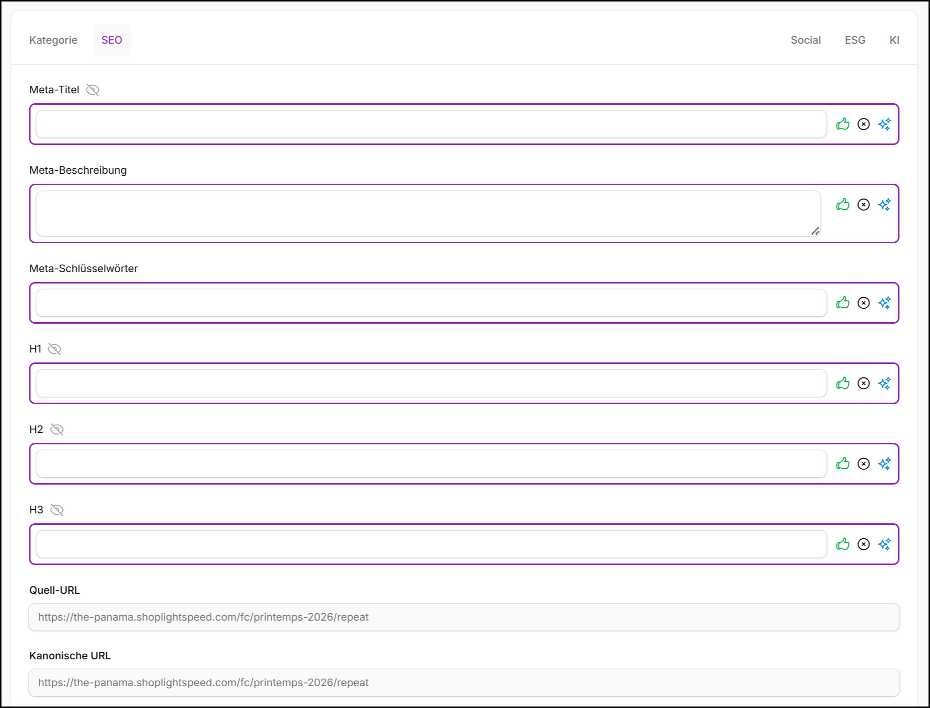 Im Gegensatz zur Kategorie-Galerie (die maschinenlesbare Ausgaben visualisiert) stellt dieser Reiter die zugrunde liegenden SEO-Steuerfelder bereit, die diese Ausgaben ermöglichen.