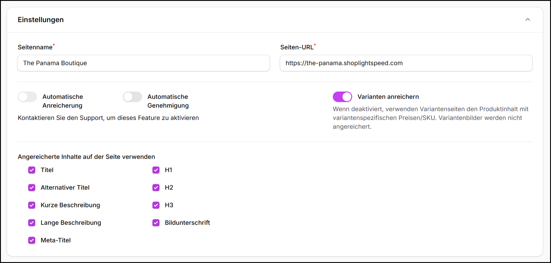 Dieser Abschnitt ermöglicht es Händlern, die Auslieferung angereicherter Inhalte für bestimmte menschenlesbare Felder selektiv zu deaktivieren, während die interne Anreicherung erhalten bleibt.
