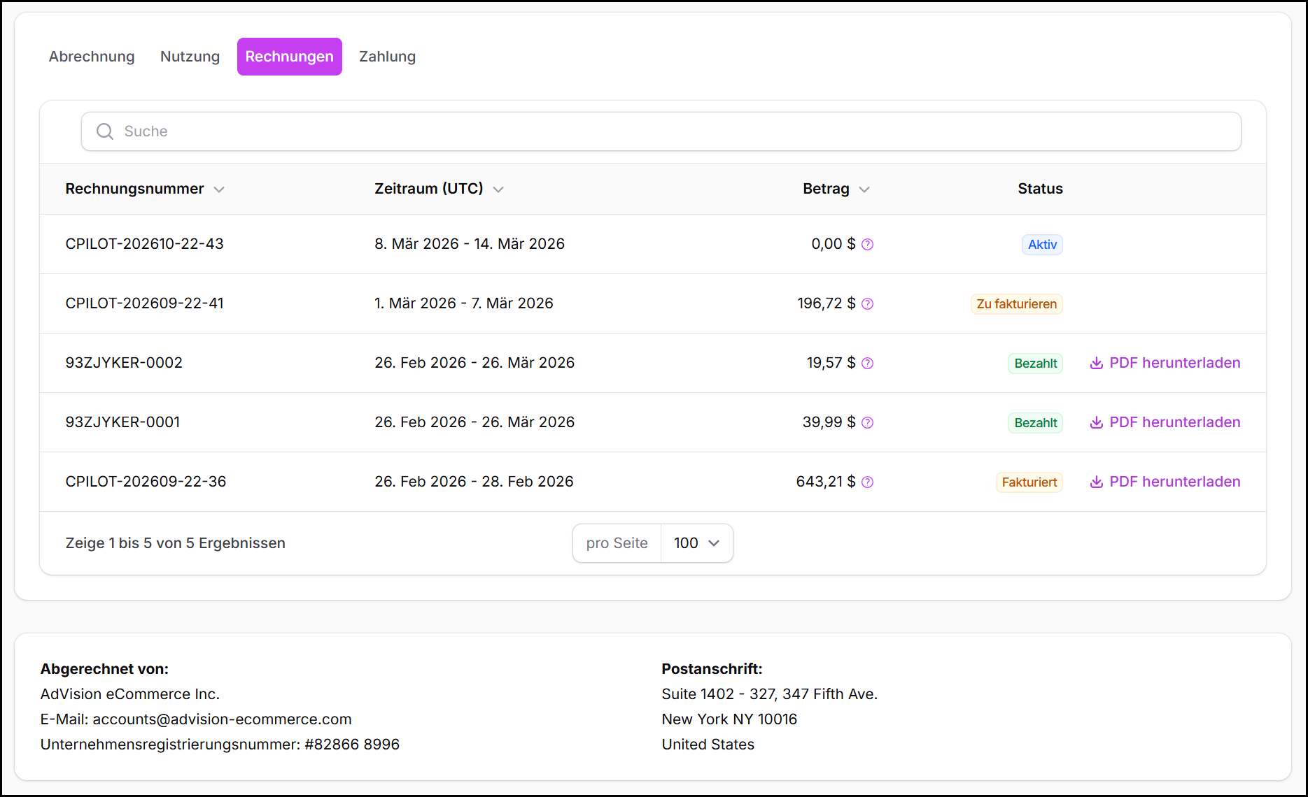 Abonnementgebühren werden unabhängig verwaltet und erscheinen nicht in der Nutzungstabelle.